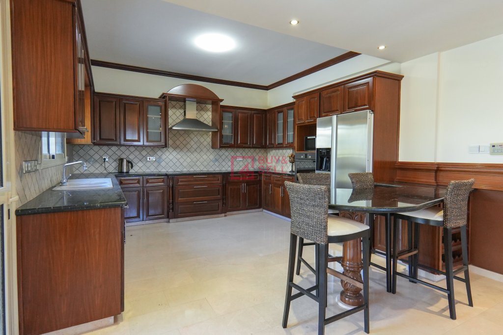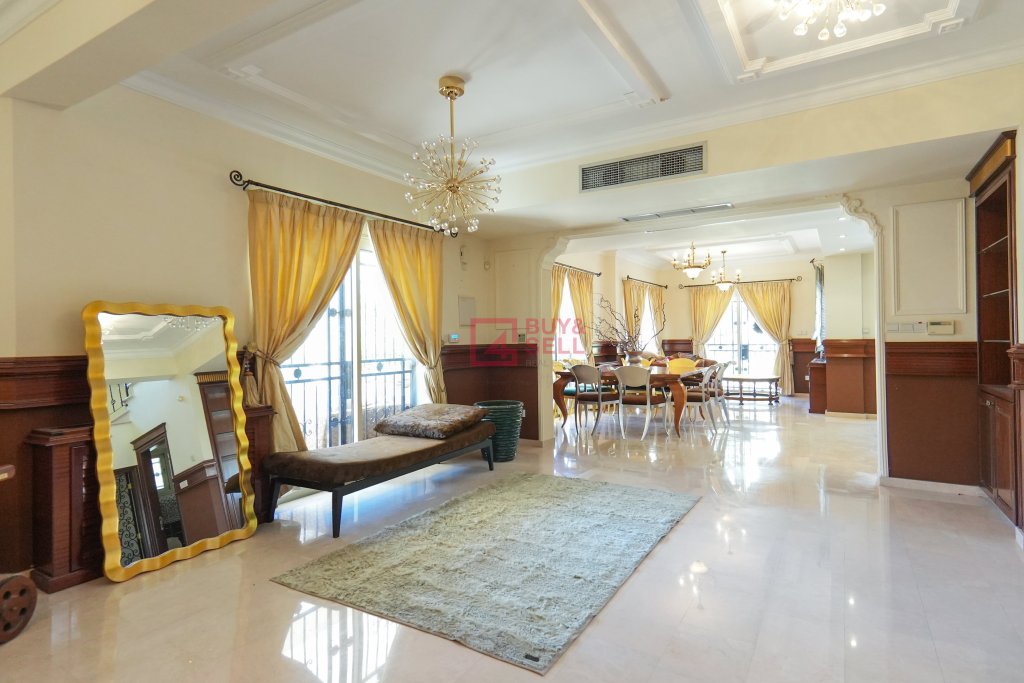 Upon entering, you are greeted by a grand foyer adorned with tasteful decor and fine craftsmanship. The ground floor seamlessly integrates the various living spaces, including a cozy living room perfect for relaxation and entertaining guests. The adjacent dining area overlooks the meticulously landscaped garden, providing a picturesque backdrop for every meal.
