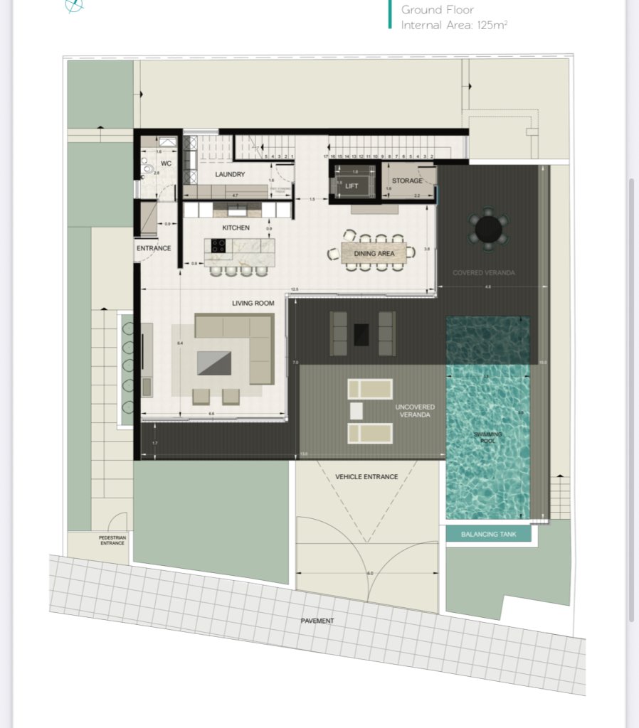 • Ground floor: 125m² (living room, kitchen, dining, storage, laundry, WC, covered & uncovered verandas, pool area)