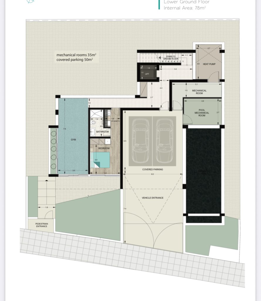 • Basement: 78m² (includes 1 bedroom, bathroom, gym, mechanical rooms, and 50m² covered parking for 2 cars)