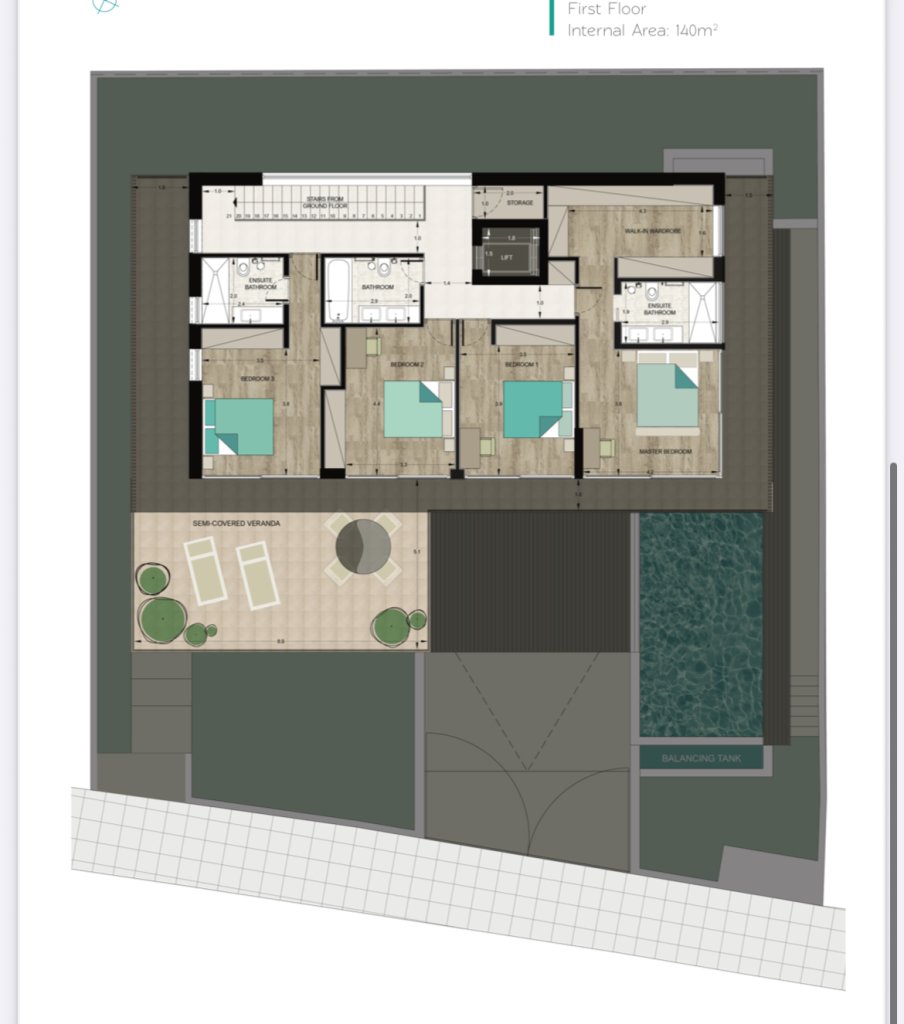 • First floor: 140m² (4 bedrooms – including master with walk-in wardrobe and en-suite, 2nd en-suite, 2 bedrooms sharing bathroom, plus veranda)