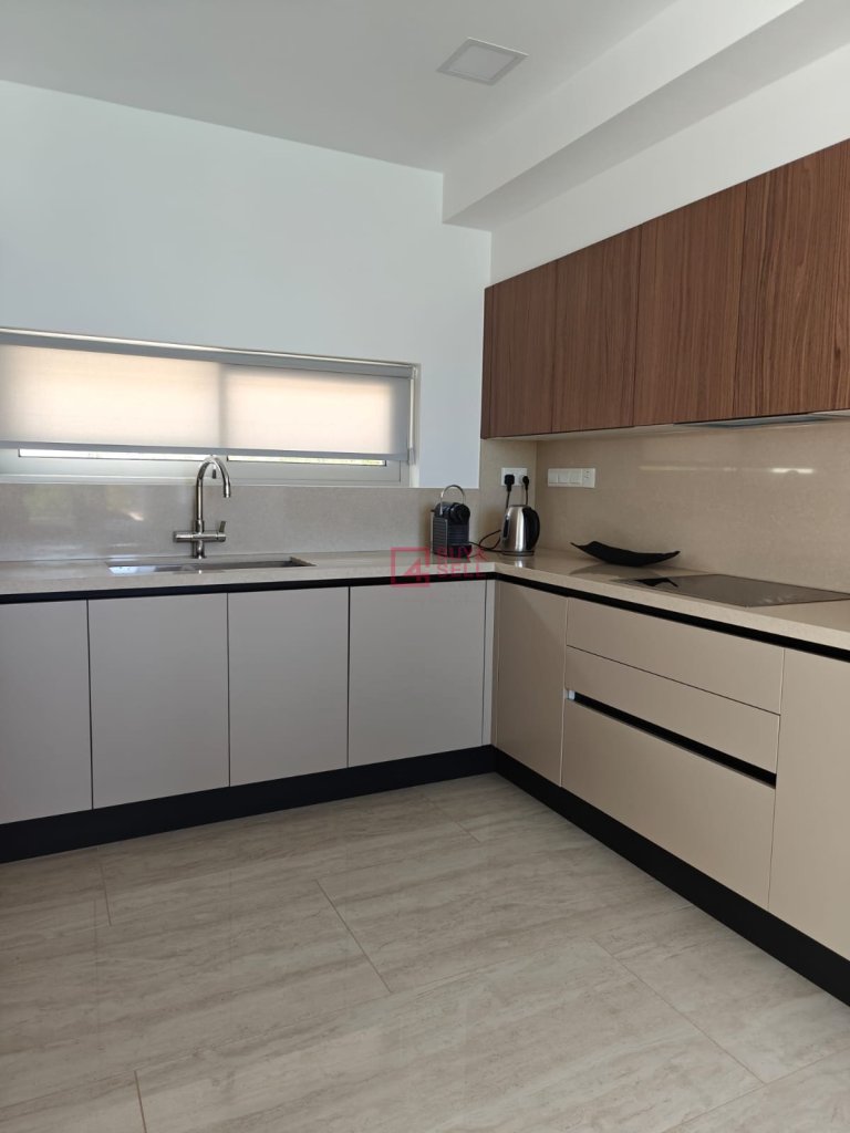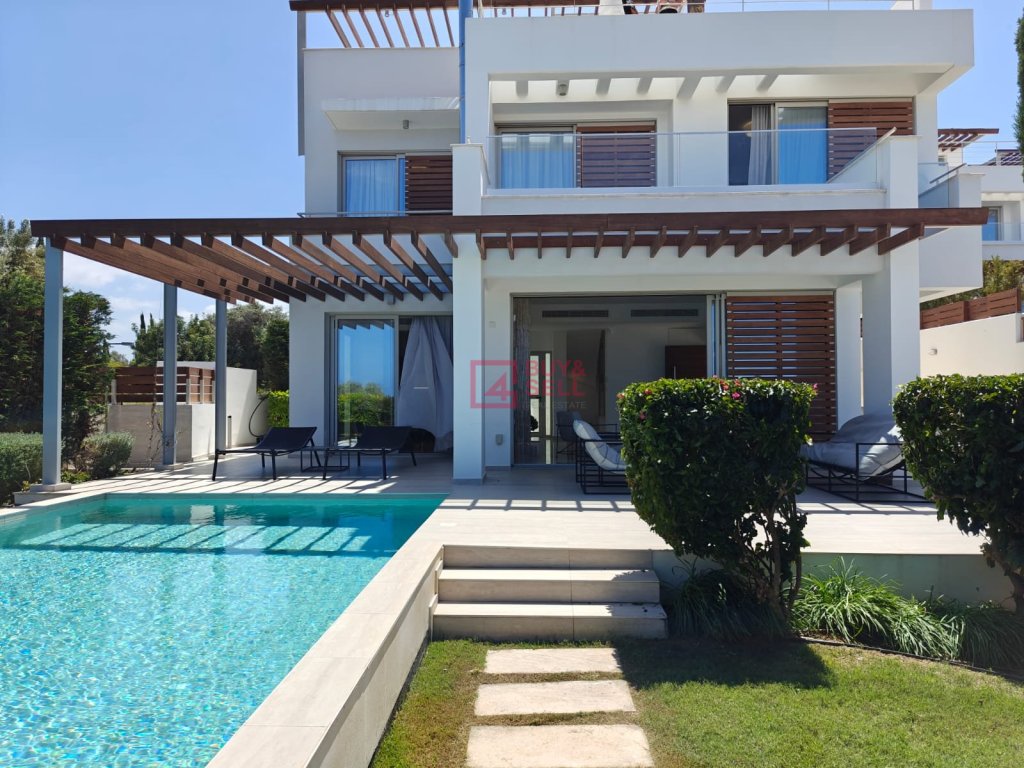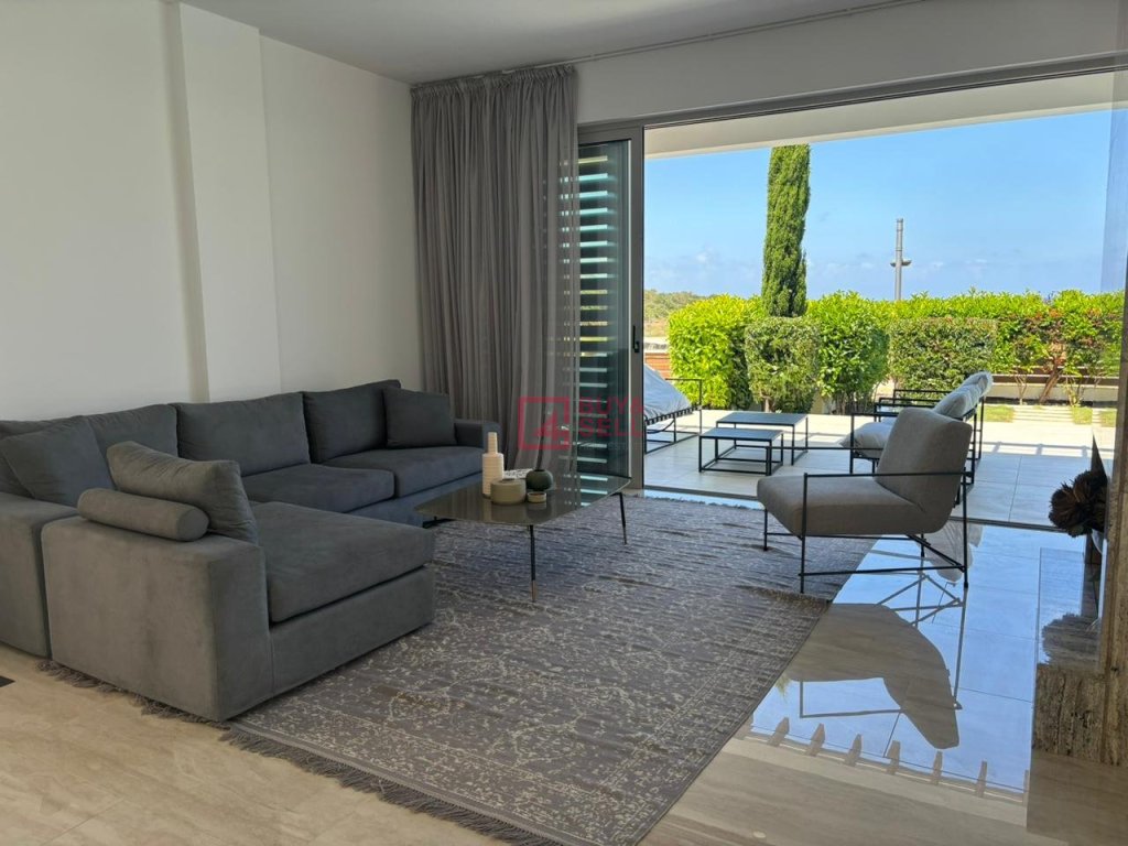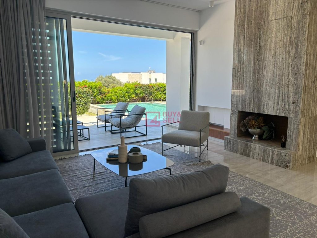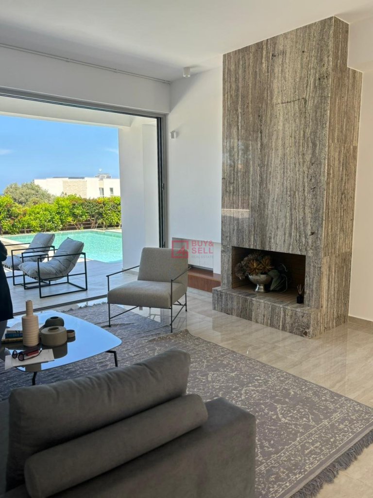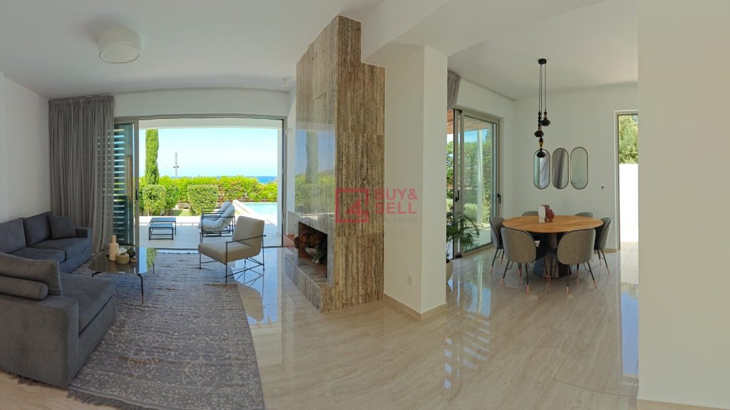 For those who love to entertain, the villa offers ample opportunities both indoors and outdoors. Slide open the glass doors to reveal a sprawling terrace, complete with a shimmering swimming pool overlooking the sea. Here, you can bask in the warm Cypriot sun, host al fresco dinners with loved ones, or simply unwind in the tranquil ambiance.