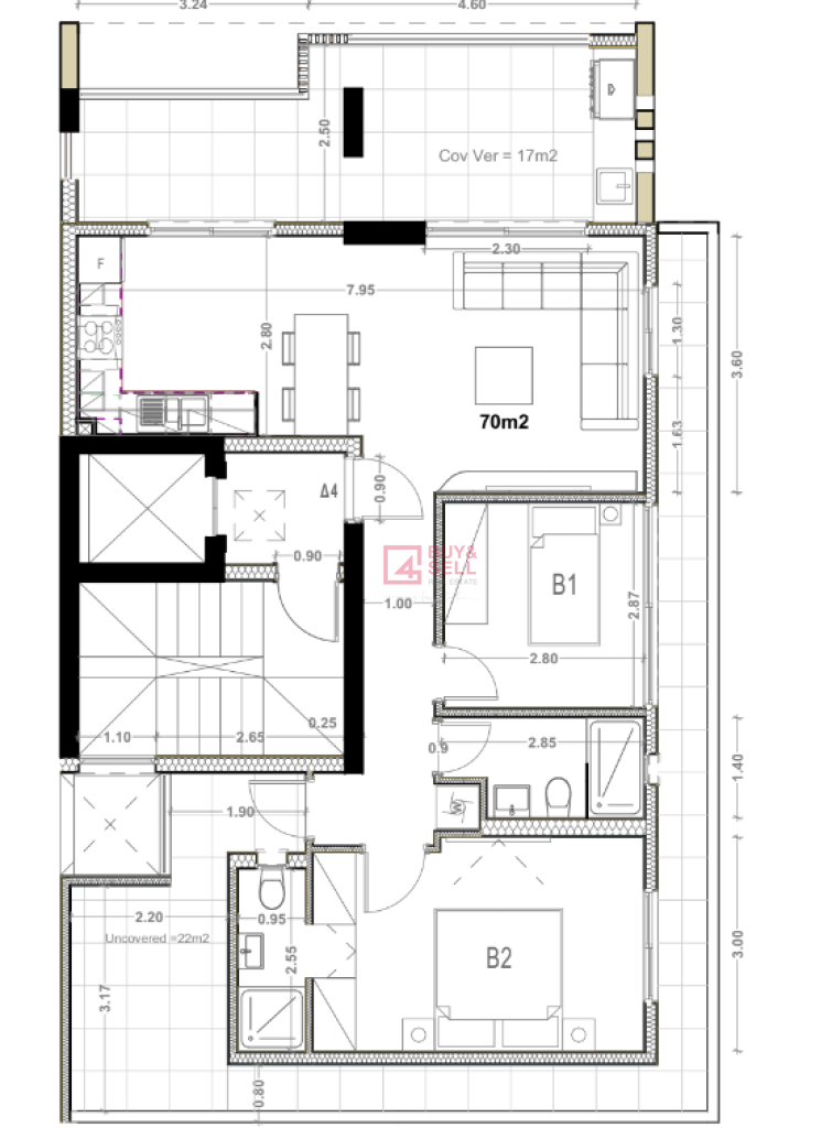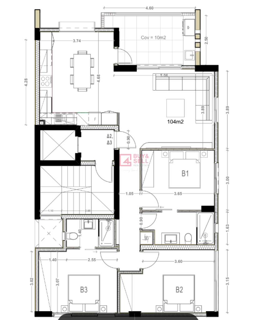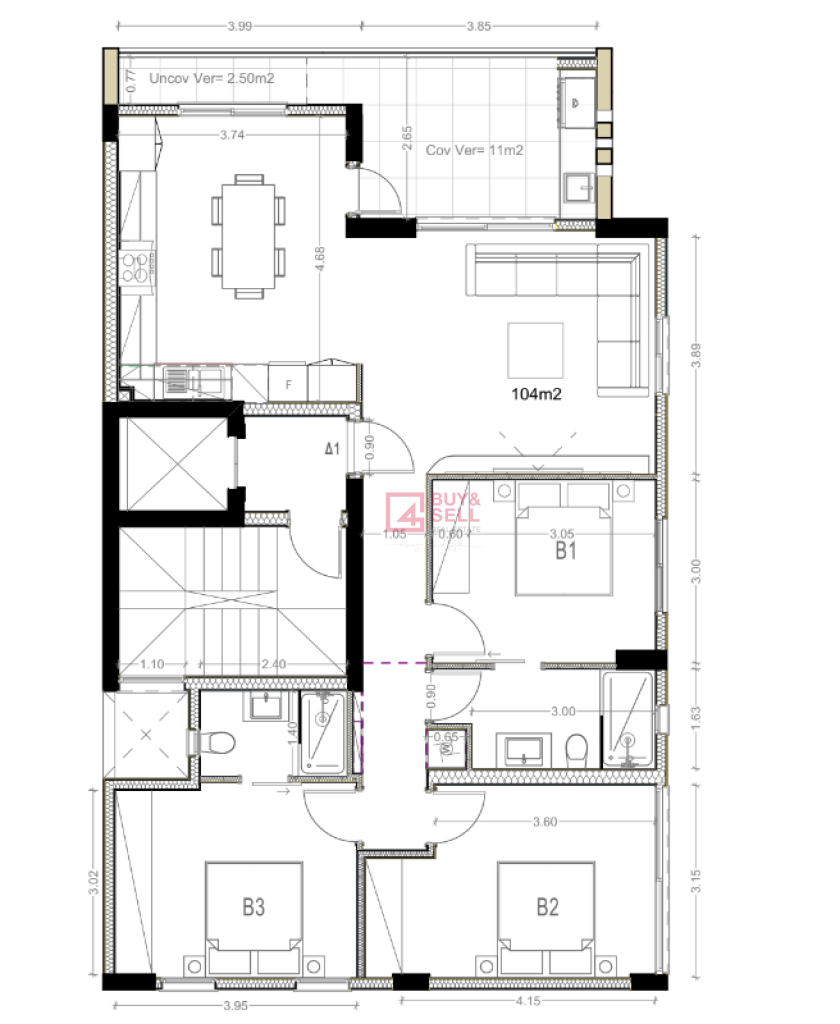 The 4th floor is dedicated to a luxurious 2-bedroom penthouse (134.5 m²), offering a large open living space, expansive covered (18 m²) and uncovered (26 m²) verandas.