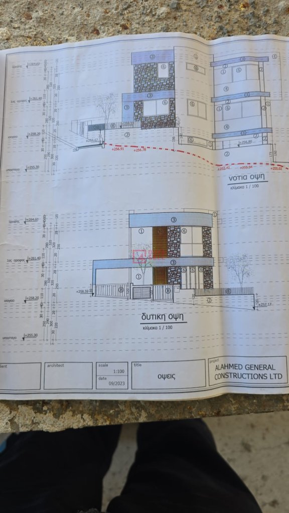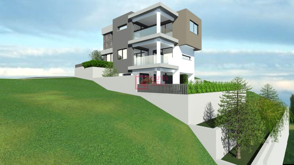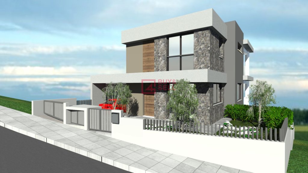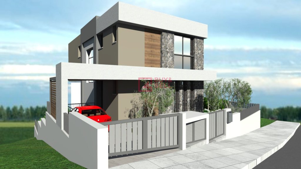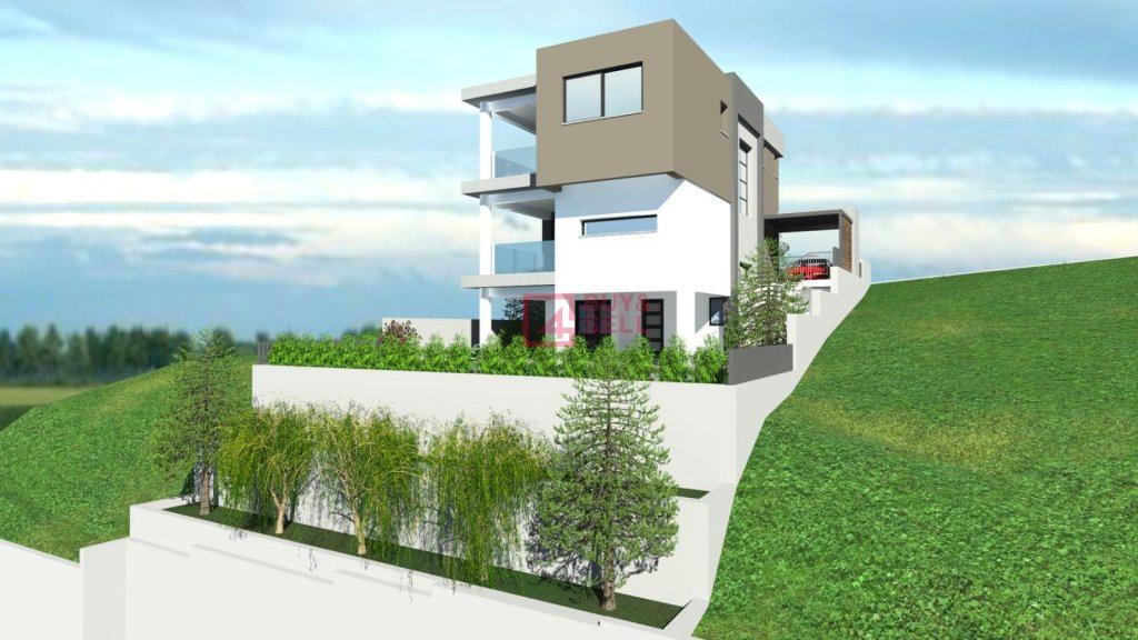 This is a modern three-storey house located in Pallodia, built on an elevated position that offers open views and a sense of privacy. The lower level features a swimming pool, providing an ideal space for relaxation and leisure.