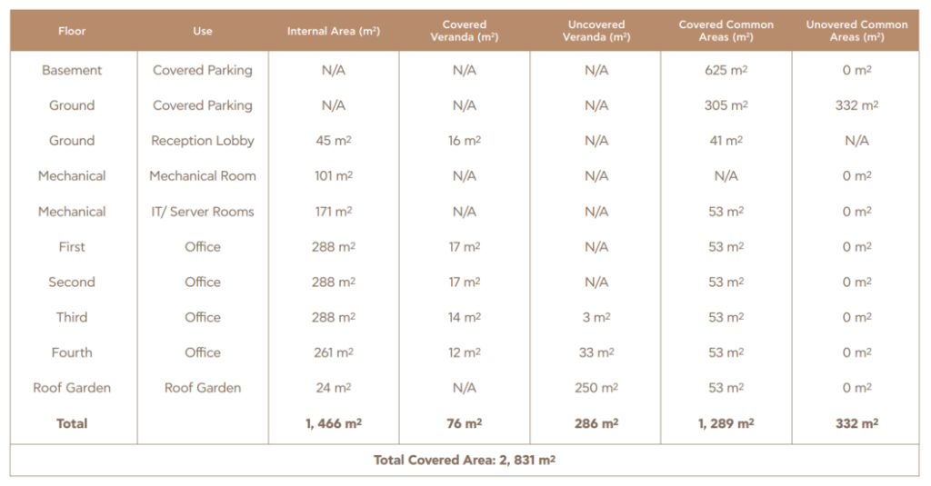 Modern design under construction office building with basement, a ground floor level, a mezzanine level and four upper floors.