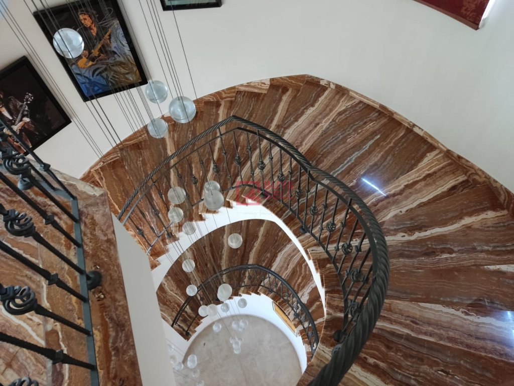 With generous living spaces, the ground floor spans 244 m², the first floor covers 393 m², and the upper floor offers 256 m². Additionally, a 25 m² rooftop area provides an ideal spot for relaxation. For added convenience, a separate 52 m² staff house is included.