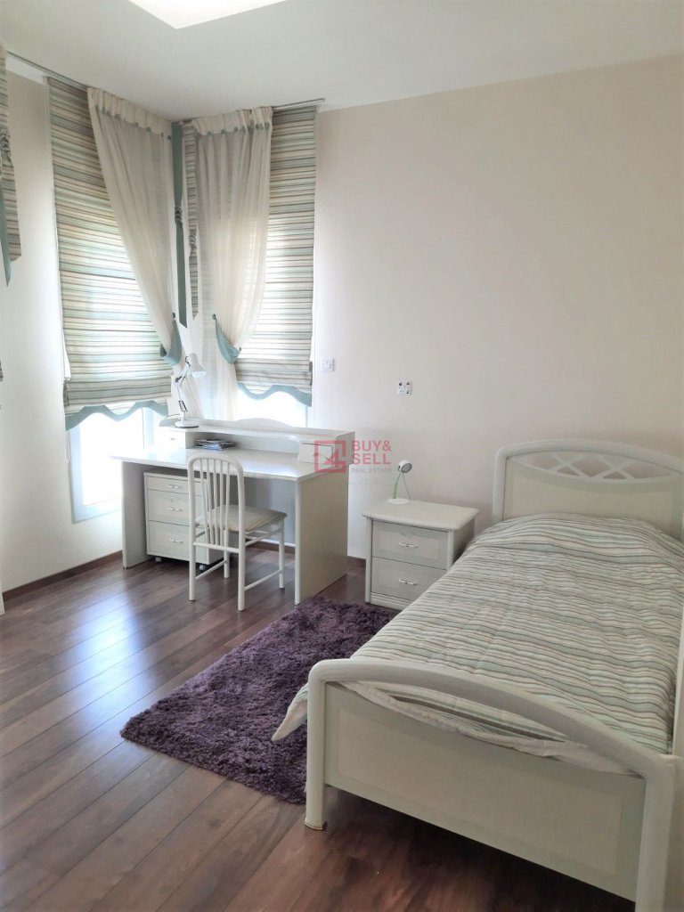 It consists 3 specious bedrooms, 1 guest WC, 2 bathrooms, security system, electric shutters, underfloor heating, swimming pool, barbeque zone, roof garden, covered parking for 2 cars, well groomed garden and territory around.